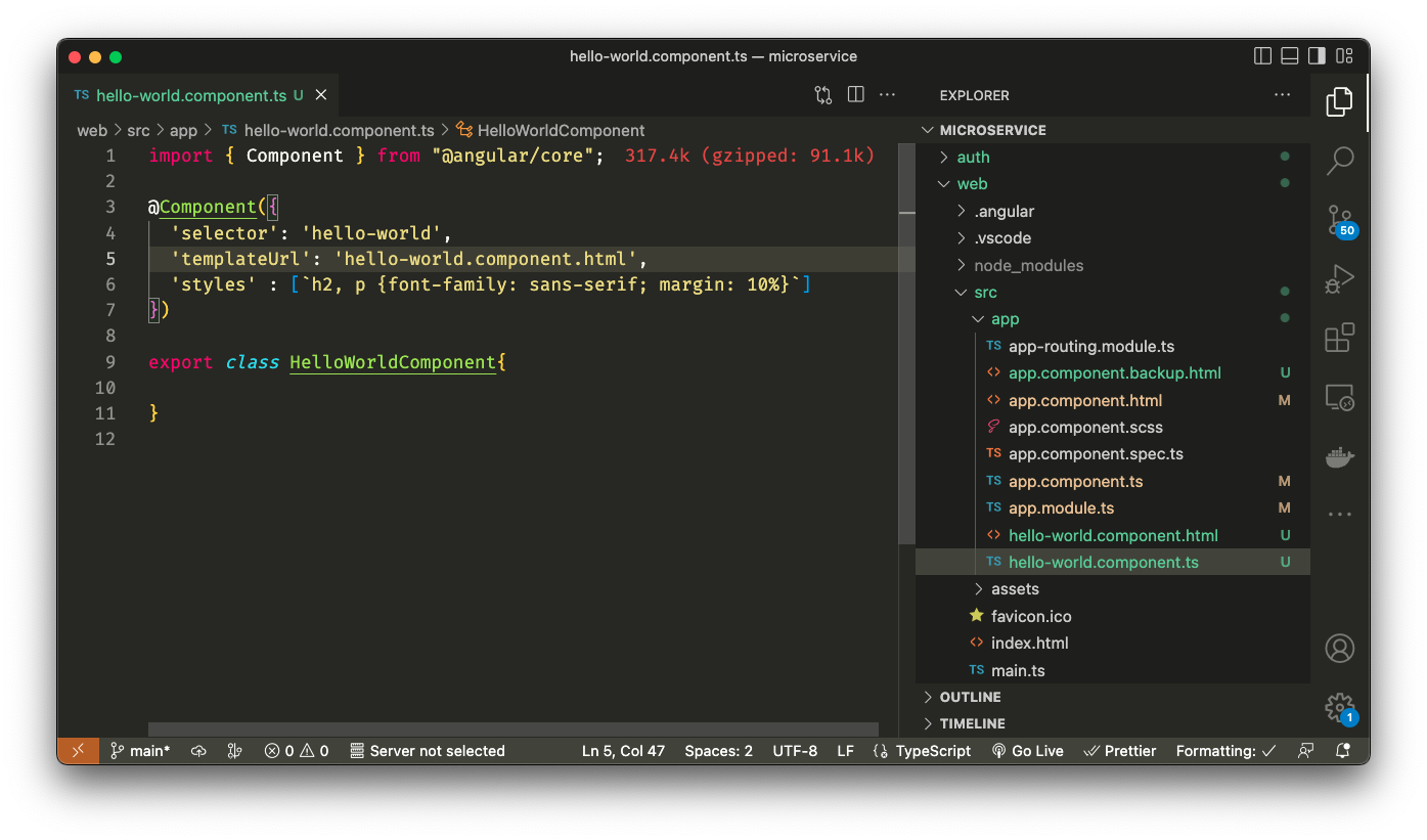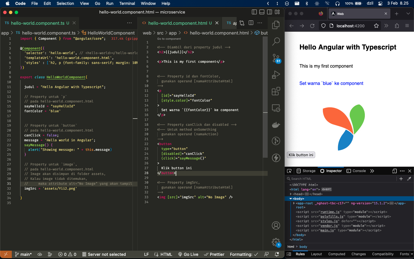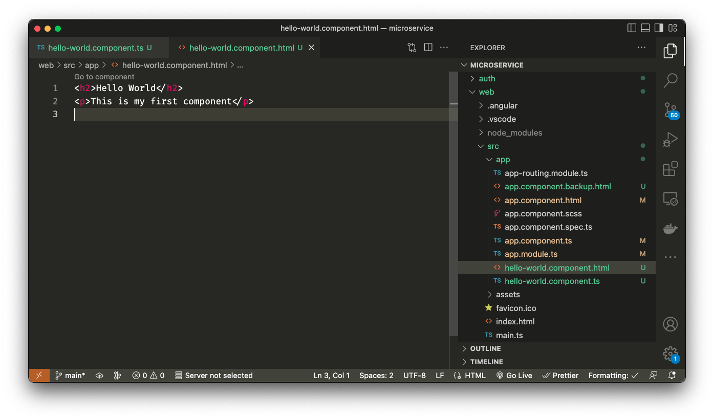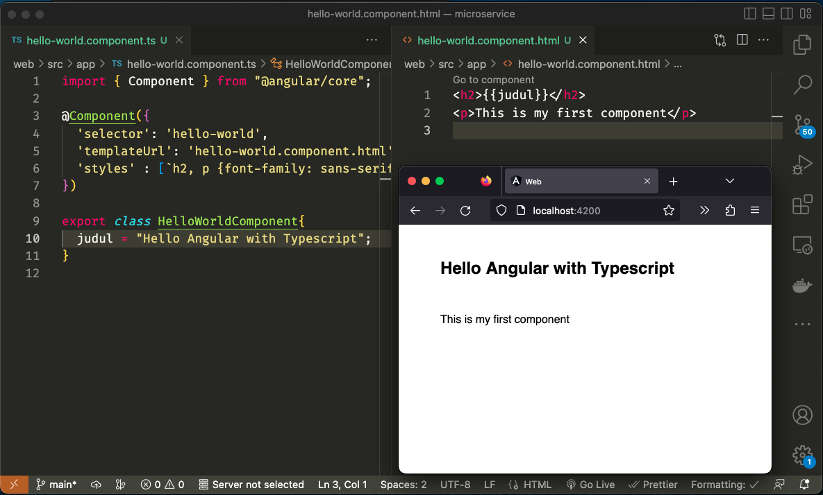 Lanjutan dari https://dzil.my.id/read/belajar-angular-basic-application-1, kita akan merubah `template` ke `templateUrl` pada `hello-world.component.ts` dengan value `hello-world.component.html`. Kita akan menyalin hardcode value `template` ke sebuah file baru yaitu `hello-world.component.html` sebagai berikut.