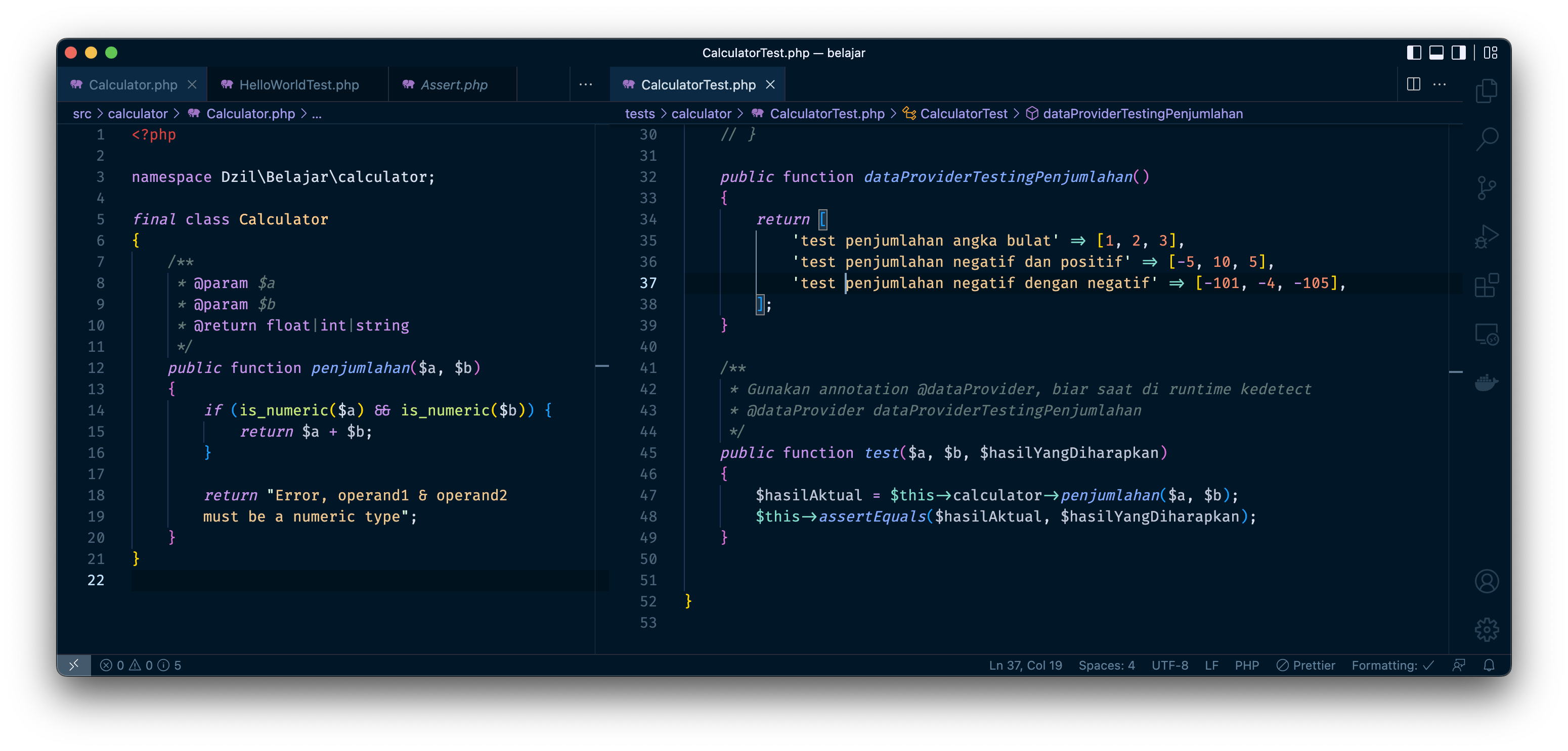 Eksplore function bawaan PHPUnit, misalnya assertEqual